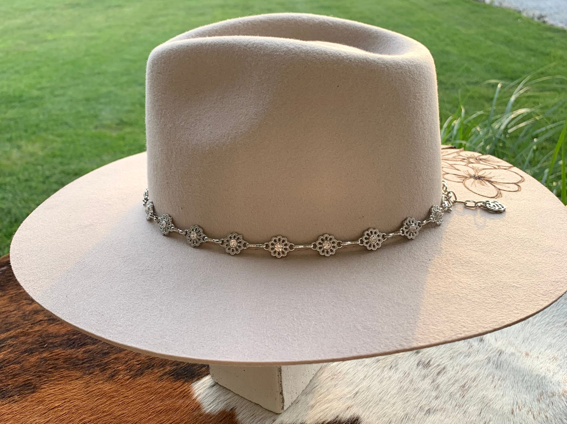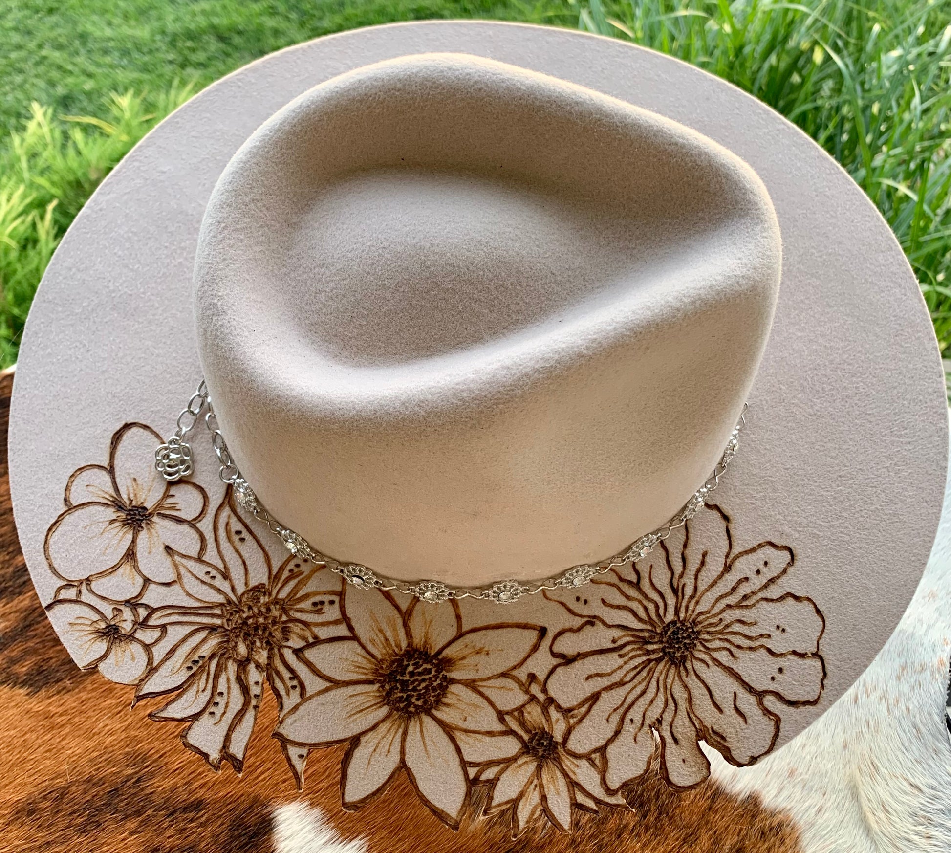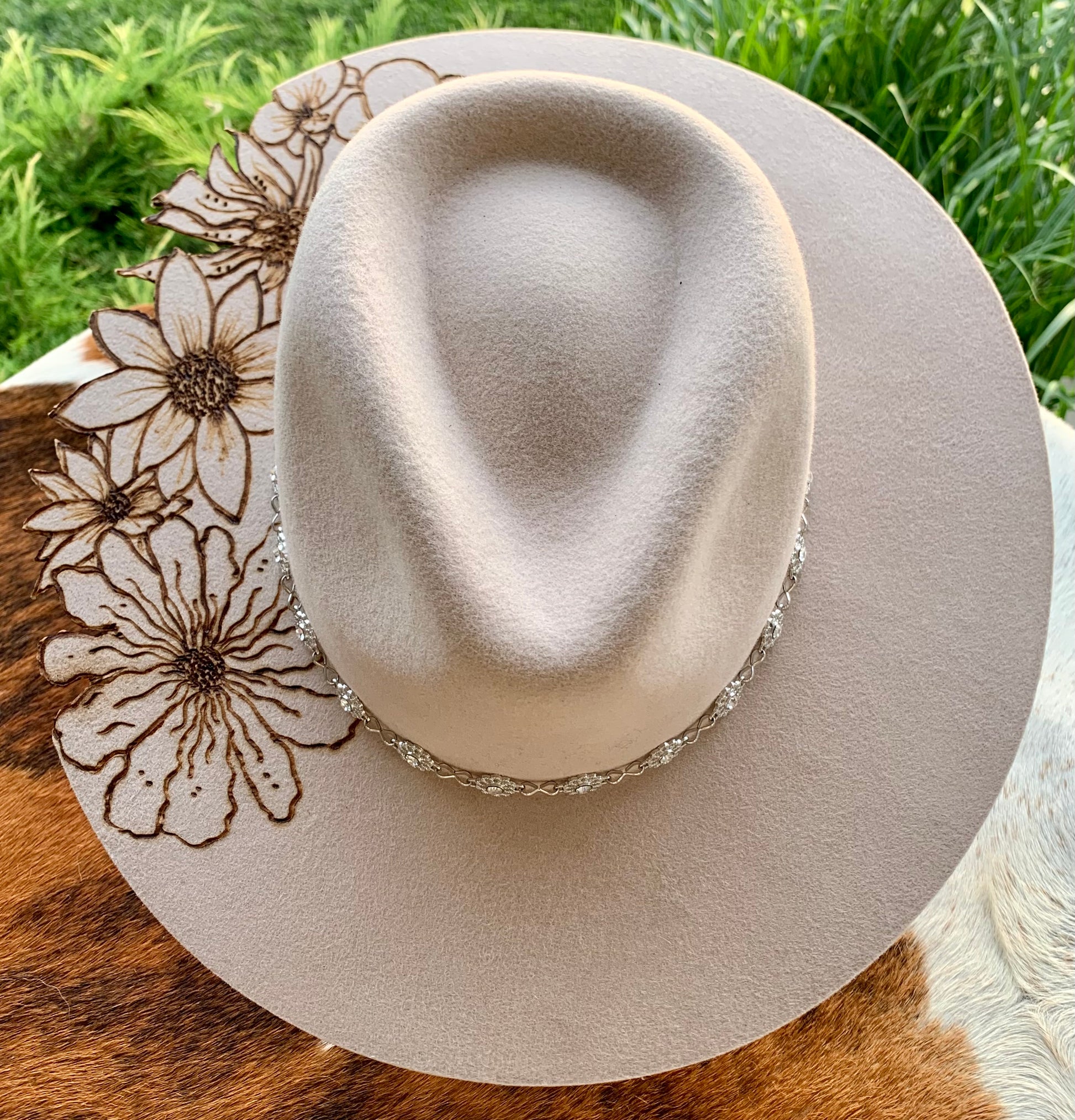 Daliah is an elegant and striking show stopper, with its live edge of burned flowers cut to enhance the detail artwork. The added touch of a silver, flowered rhinestone band adds a touch of glamour to this breathtaking headpiece. A must-have for any special occasion.