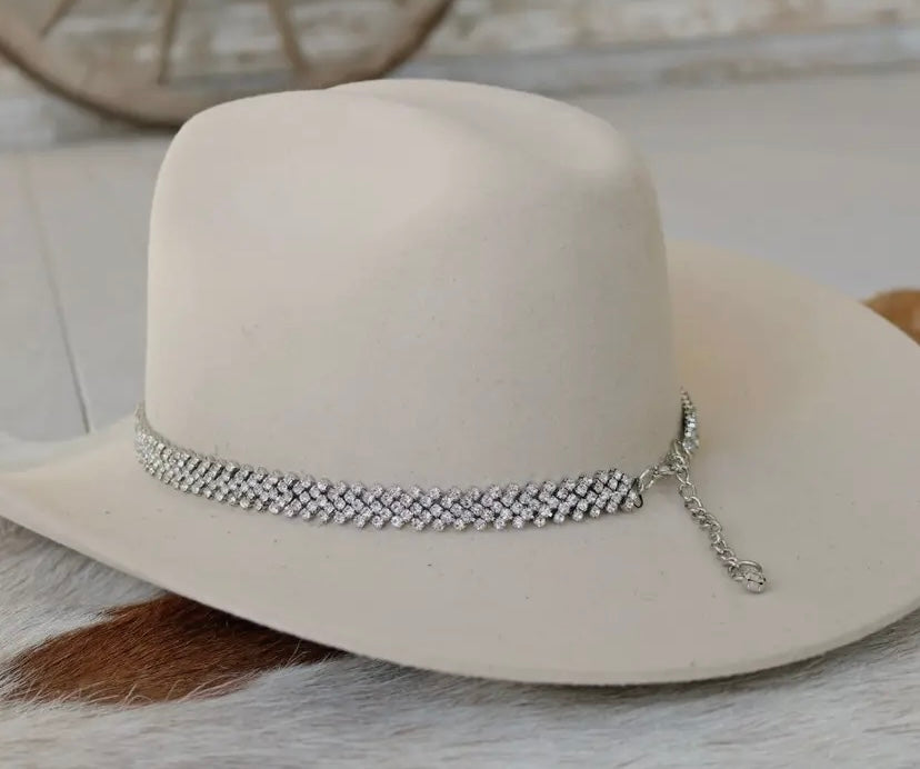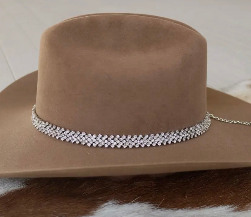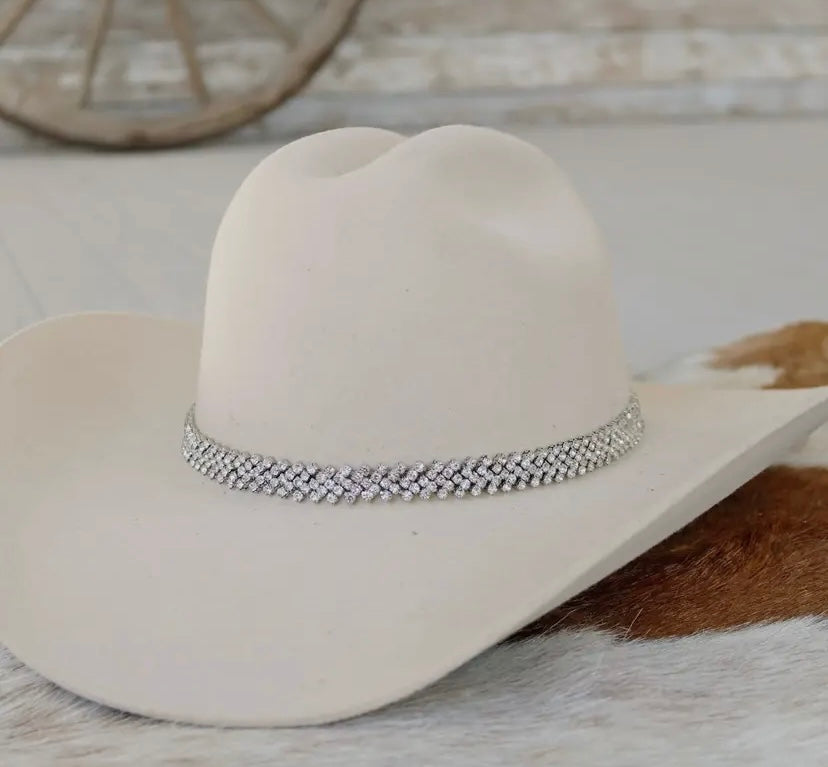 5 layer, Silver, Rhinestone hat band. Clear rhinestones set in a silver setting. Clasp is adjustable on the back.